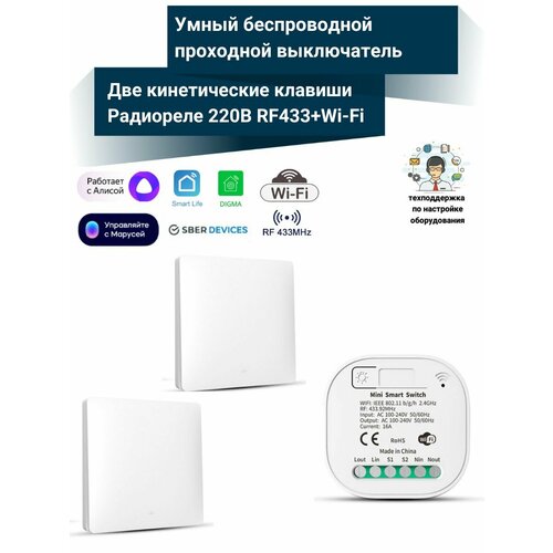 Умный беспроводной проходной выключатель света (2 кинетических выключателя + умное реле 433МГц+Wi-Fi)