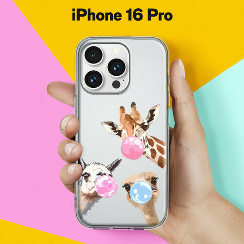 Силиконовый чехол на iPhone 16 Pro с принтом "Жираф, Лама, Страус" с прозрачными бортиками