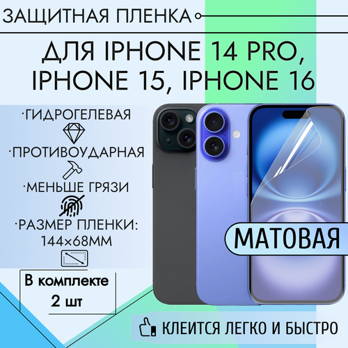 Гидрогелевая пленка на iPhone 15, 16, 14 Pro матовая антиблик (2шт.) / защита Айфон 15, 16, 14 Про