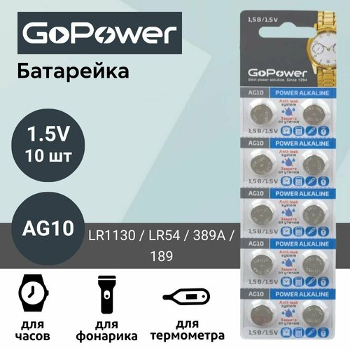 Батарейки GoPower AG10 (LR1130, LR54, 389A, 189) Alkaline 1.5V (10 шт)
