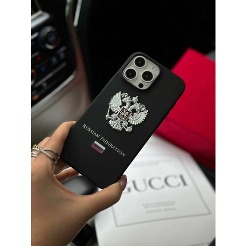 Черный чехол на iPhone 16 Pro с гербом России серебро