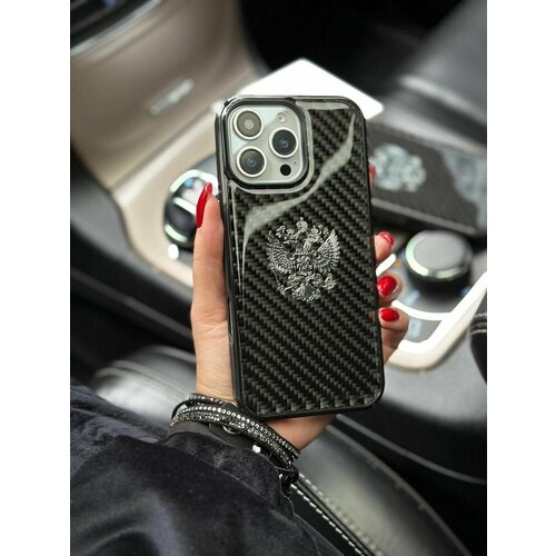 Черный карбоновый чехол на iPhone 16 Pro Max с гербом России