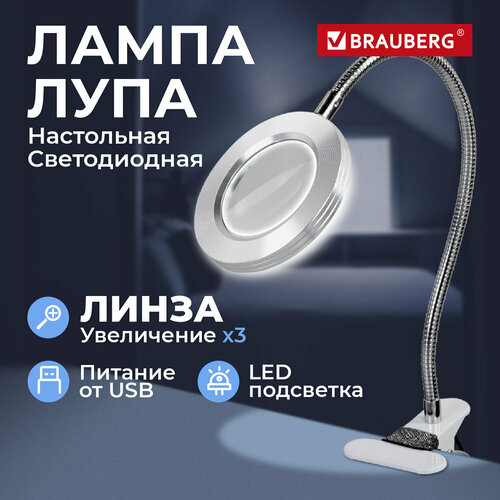 Лупа (увеличительное стекло) для чтения и рукоделия настольная на прищепке с Led-Подсветкой, диаметр 75 мм, увеличение 3, Brauberg, 455931