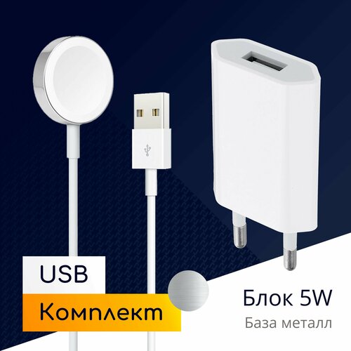 Комплект: зарядка для Apple Watch с металлической базой (USB, 1 метр) и блок питания (5 Вт, 1А) / Original Drop
