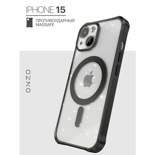Противоударный чехол мэгсэйф для iPhone 15 / Бампер на Айфон 15 с рельефными черными гранями, прозрачный с блестками