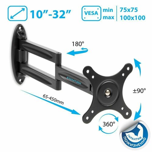 серыйОписание Настенный поворотно-наклонный кронштейн для телевизоров и мониторов с диагональю от 22 до 65 дюймов. Настенный двухколенный наклонно-поворотный кронштейн Kromax Atlantis-45 предназначен для средних и больших телевизоров и плазменных панелей с диагональю от 22 до 65 дюймов. Усиленная двуручная конструкция имеет широкий диапазон регулировки положения и перемещения телевизора, исключительную плавность движений, а два параллельных колена исключают перекос экрана в любом положении. Сохраняя все преимущества и функциональность шарнирных кронштейнов, кронштейн Kromax Atlantis-45 отличается особой прочностью и надёжностью, изящным дизайном, исключительной маневренностью и новой быстрой системой сборки. Широкие возможности по повороту, наклону, перемещению в различных направлениях, а также изменение угла наклона экрана дают возможность устранить блики и обеспечить максимальный комфорт и удобство при просмотре с любой точки. Регулировка наклона осуществляется лёгким прикосновением. Специальные пластиковые накл