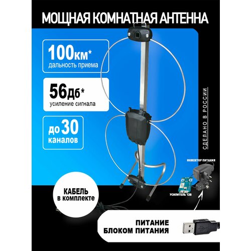 Антенна для цифрового тв комнатная МИР-АНТЕНН-Дон-8-А3 с усилителем (12В), для ТВ 360 градусов + блок питания + кабель