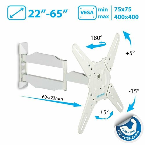 Особенности* Расстояние от стены до экрана при сложенном состоянии кронштейна составляет менее 6 сантиметров.* Наклонно-поворотная конструкция.* Съёмная монтажная пластина и водяной уровень.* Кабель-канал.* Устройство подходит для установки телевизоров с разной диагональю.