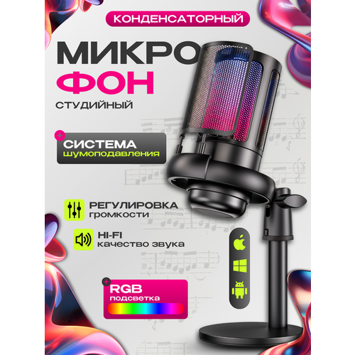 Микрофон студийный, конденсаторный, с подсветкой, HI-FI звук, POP-фильтр