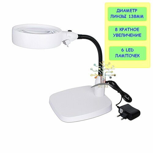 Лупа настольная на гибком штативе от Салона Часов 8x, диаметр линзы 138 мм с подсветкой (6 LED) для чтения и рукоделия