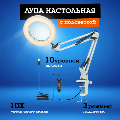 Лампа настольная с лупой 10X, на гибком кронштейне 25x25 см, на струбцине, линза 105 мм, подсветка - регулировка яркости и цвета