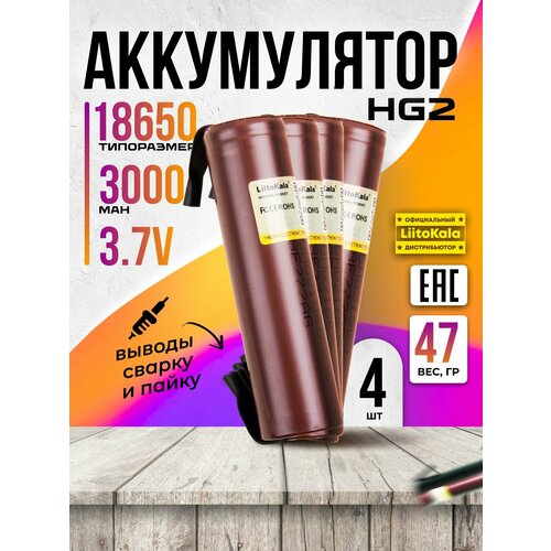 Аккумулятор 18650 LiitoKala HG2 Li-ion 3.7В 3000 mAh с выводами для шуруповёртов, пылесосов, вейпов и т. д. 4 шт.