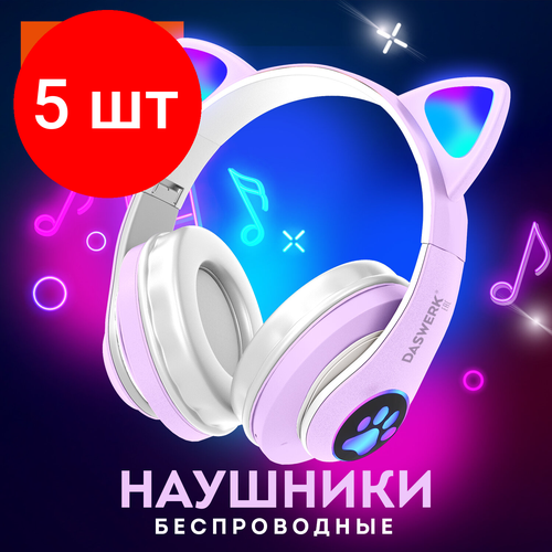 Комплект 5 шт, Наушники беспроводные игровые накладные, с ушками, светящиеся, фиолетовые DASWERK STN-28, 513801