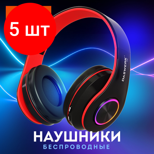 Комплект 5 шт, Наушники беспроводные большие светящиеся накладные, красные DASWERK B-39, 513807