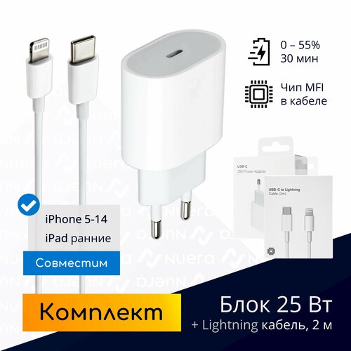 Комплект: быстрая зарядка для iPhone, 25 Вт, Type-C + длинный кабель USB-C - Lightning, 2 метра, с чипом / Original drop