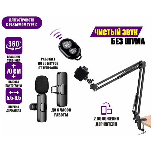 Усиленный пантограф ST с усиленной струбциной, держателем телефона, кнопкой Bluetooth, нагрузка до 1.6 кг, и беспроводной петличный микрофон