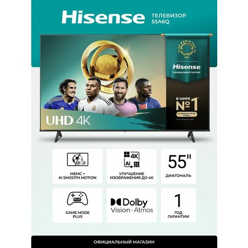 Телевизор Hisense 55A6Q 55 дюймов с Смарт ТВ, Wi-Fi, 4K UHD, Dolby Vision, игровым режимом, голосовым управлением