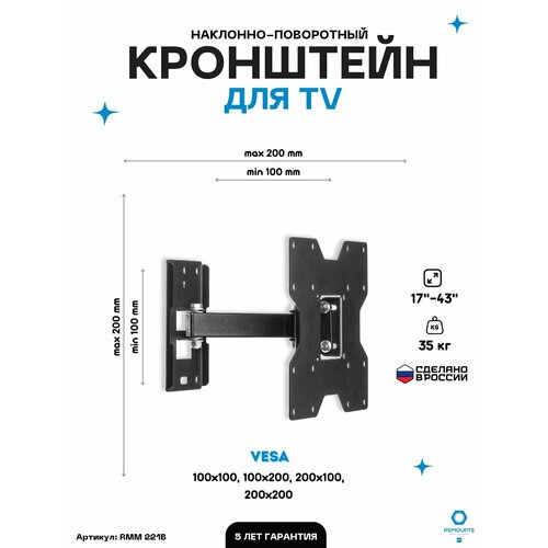 Кронштейн для телевизора наклонно-поворотный Remounts RMM 221B 17"-43" ТВ vesa 200х200