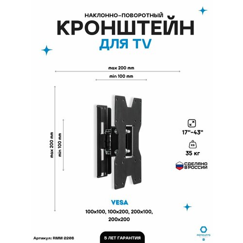 Кронштейн для телевизора наклонно-поворотный Remounts RMM 220B 17"-43" ТВ vesa 200х200