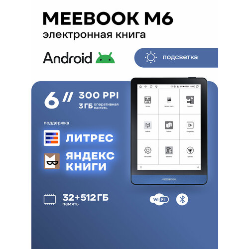 MEEBOOK M6 - электронная книга 6 дюймов с подсветкой, поддержкой Литрес и Яндекс Книга (разрешение 300 PPI, ОС Андроид, Wi-Fi, интернет)