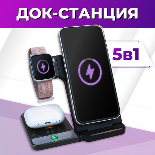 Беспроводная зарядка 5 в 1 MagSafe 15 Ватт на iPhone, Apple Watch, AirPods / Чёрная док станция / Black