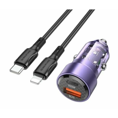 Автомобильное зарядное устройство USB QC3.0/Type-C PD 65W Черный (Кабель Type-C- Lighting в комплекте), фиолетовый