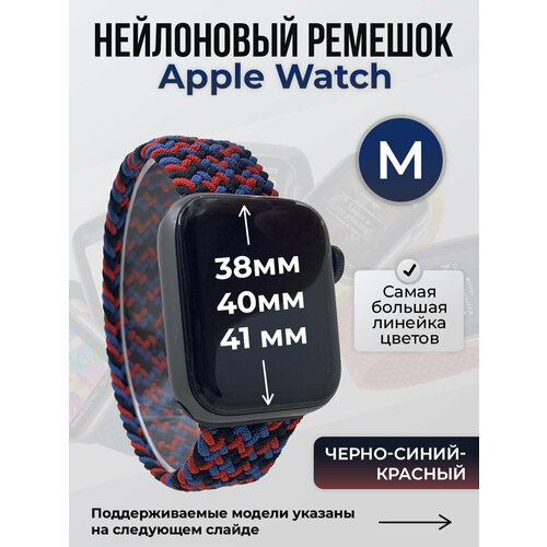 Нейлоновый ремешок для Apple Watch 1-9 / SE (38/40/41 мм), без застежки, черно-синий-красный, размер M