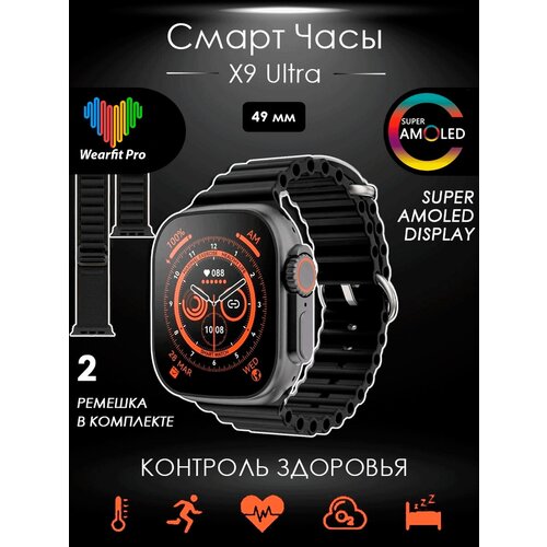 Умные часы X9 Ultra, Smart Watch х9 ультра Super Amoled, 9 ultra, 49 mm, Wearfit Pro, Android, iOS , SMS, Звонки, 2 ремешка, Pricemin, Черные