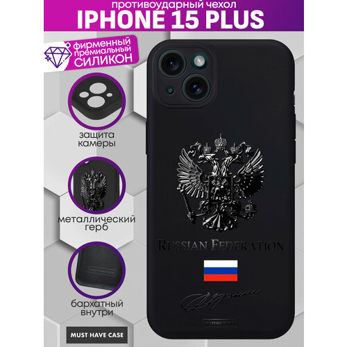 Чехол на IPhone 15 Plus Премиум с Черным металлическим Гербом РФ
