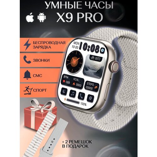 Умные часы X9 PRO, Smart Watch Super Amoled X9 PRO, Смарт часы 9pro, 45 mm, Wearfit Pro, Android, iOS, SMS, Звонки, 2 ремешка, Amoled, Серебрянные