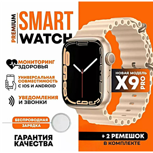 Смарт часы Х9 pro / Умные часы 2023 AMOLED экран Smart Watch 45 mm, звонки по Bluetooth, 2 ремешка, золотистые