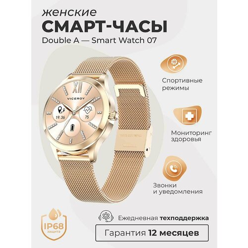 Смарт-часы умные наручные Double A Smart Watch 07 женские, круглые, водонепроницаемые, золотистые