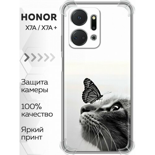 Дизайнерский силиконовый с усиленными углами чехол для Хонор Х7а / Huawei Honor X7a Кот и бабочка