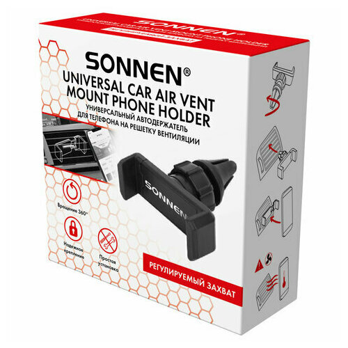 Держатель для телефона в авто на решетку вентиляции SONNEN, зажим до 85 мм, вращение 360°, 354922