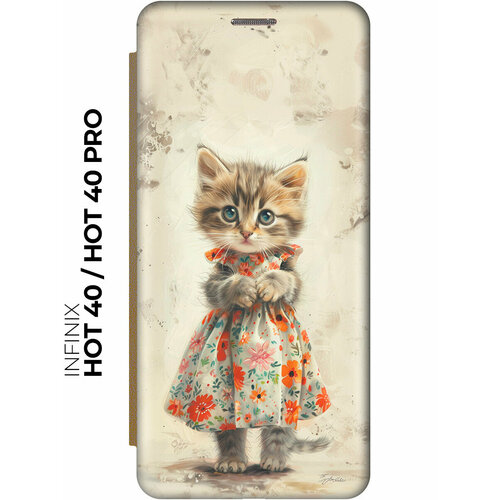 Чехол-книжка на Infinix Hot 40 / Hot 40 Pro / Инфиникс Хот 40 / Хот 40 Про с рисунком "Кошечка в цветочном платье" золотой