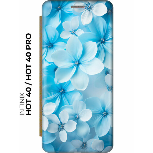 Чехол-книжка на Infinix Hot 40 / Hot 40 Pro / Инфиникс Хот 40 / Хот 40 Про с рисунком "Бело-голубые цветы" золотой