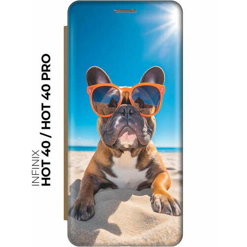 Чехол-книжка на Infinix Hot 40 / Hot 40 Pro / Инфиникс Хот 40 / Хот 40 Про с рисунком "Бульдог на пляже" золотой