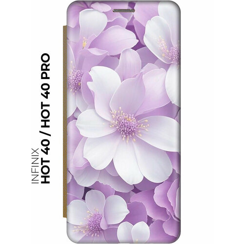 Чехол-книжка на Infinix Hot 40 / Hot 40 Pro / Инфиникс Хот 40 / Хот 40 Про с рисунком "Бело-фиолетовые цветы" золотой