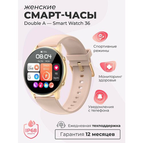 Смарт-часы умные наручные Double A Smart Watch 36 женские и мужские, круглые, водонепроницаемые, розовые
