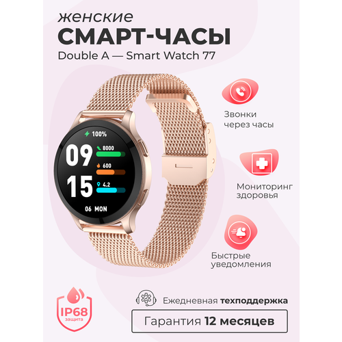 Смарт-часы умные наручные Double A Smart Watch 77 женские и мужские, круглые, водонепроницаемые, золотистые