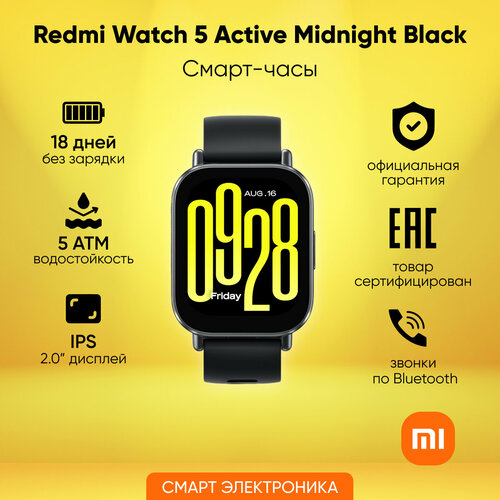 Смарт-часы Xiaomi Redmi Watch 5 Active, 2", (BHR8784GL), IPX8, замер SpO2, 470 мАч, черные