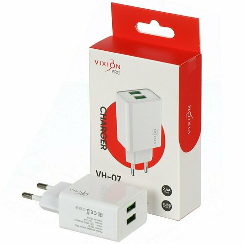 Зарядное устройство Vixion, VH-07, 220 В, 2.4 А, 2 разъема, белое, GS-00028953