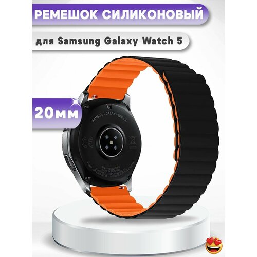 Силиконовый магнитный ремешок 20 мм для смарт-часов Samsung Galaxy Watch 5 40,44мм, 5 Pro 45мм - черный/оранжевый