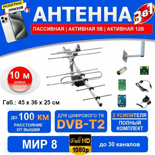 МИР 8 (3 в 1 полный комплект до 100 км) Антенна для приема цифровых каналов, штекер, 5В и 12В усилитель, инжектор блок питания кронштейн кабель