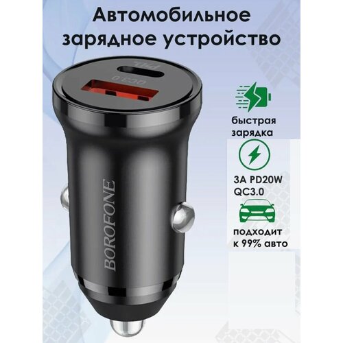 Автомобильная зарядка для телефона, BOROFONE, BZ22, с быстрым зарядом, USB+Type-C разъемы, 30W, автозарядка в машину в прикуриватель, чёрный