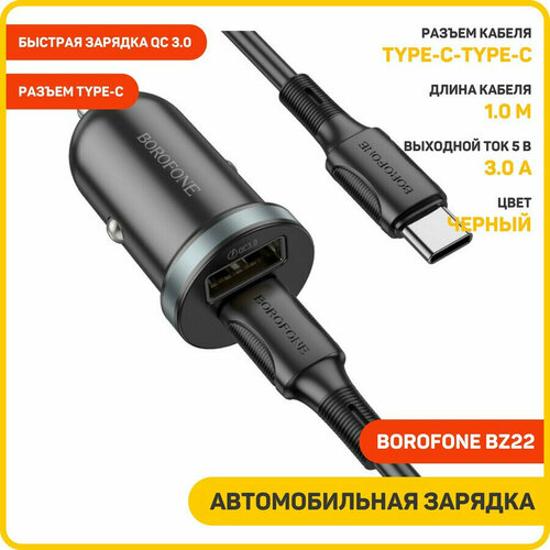 Автомобильное зарядное устройство (АЗУ) Borofone BZ22 QC 3.0 (USB+Type-C) + кабель Type-C-Type-C, 3 A