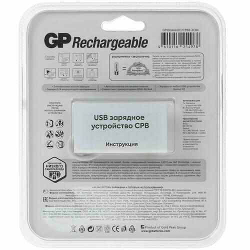 золотистый, зеленый, белыйНовое зарядное устройство GP E211270ААНС-2CRB2 на 2 слота обеспечит аккумуляторам быструю зарядку. Устройство способно заряжать одновременно 2 батареи и рассчитано на 2 формата – АА и ААА. Входящие в комплект элементы питания предварительно заряжены. Компактный и лёгкий зарядник удобно брать с собой в поездки – в ваших электронных устройствах всегда будут заряженные аккумуляторы, и приборы не отключатся в самый неподходящий момент. Кабель USB позволяет универсально заряжать устройство как от сети, так и через компьютер, в машине и т. п. От зарядного устройства со вставленными аккумуляторами можно непосредственно заряжать и гаджеты. Устройство оснащено удобной световой индикацией. Зелёный светодиод загорается на 0,5 с после подачи питания через USB. В процессе заряда светодиод мигает и горит постоянно, оповещая о полном заряде батарей.