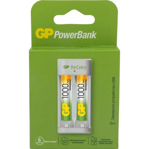Зарядное устройство GP для аккумуляторных батареек АА и ААА, на 2 слота, с аккумуляторами 2100 mAh, набор 2 шт, с кабелем micro USB