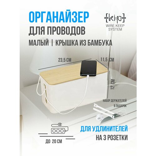 Коробка органайзер для проводов малый (23,5х11,5х12) бамбуковая крышка, короб для маскировки сетевых кабелей и шнуров для зарядки