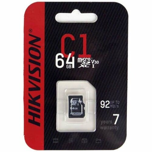 Карта памяти Hikvision microSDXC 64 ГБ Class 10, V30, A1, UHS-I U1, R/W 92/10 МБ/с, адаптер на SD, 1 шт.
